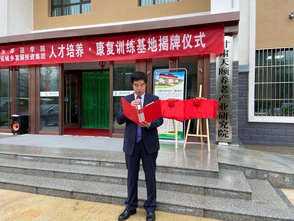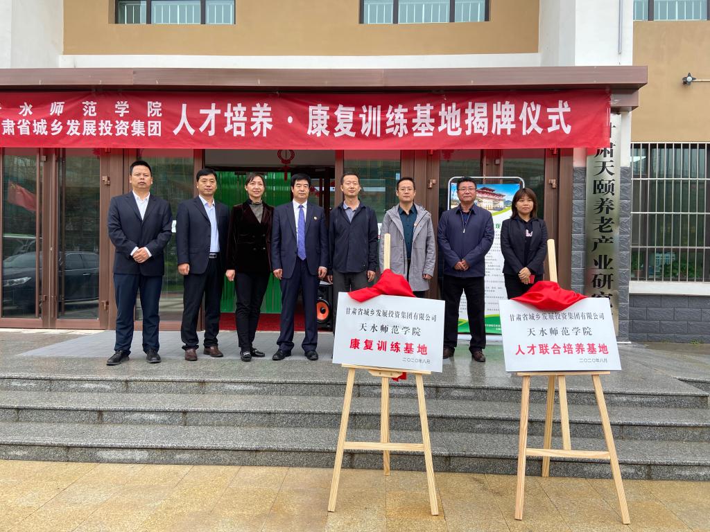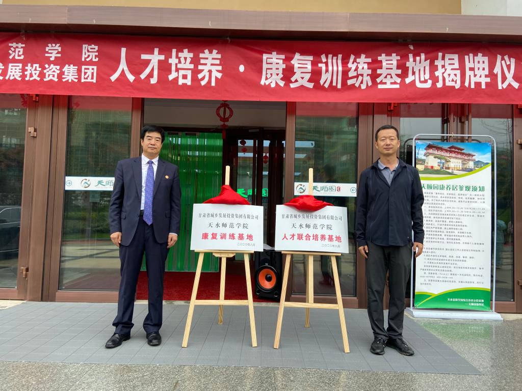 汪聚应、樊畠利分别代表校企双方揭牌“天水师范学院与甘肃省城乡发展投资集团人才培养基地”和“天水师范学院与甘肃省城乡发展投资集团康复训练基地”牌匾。