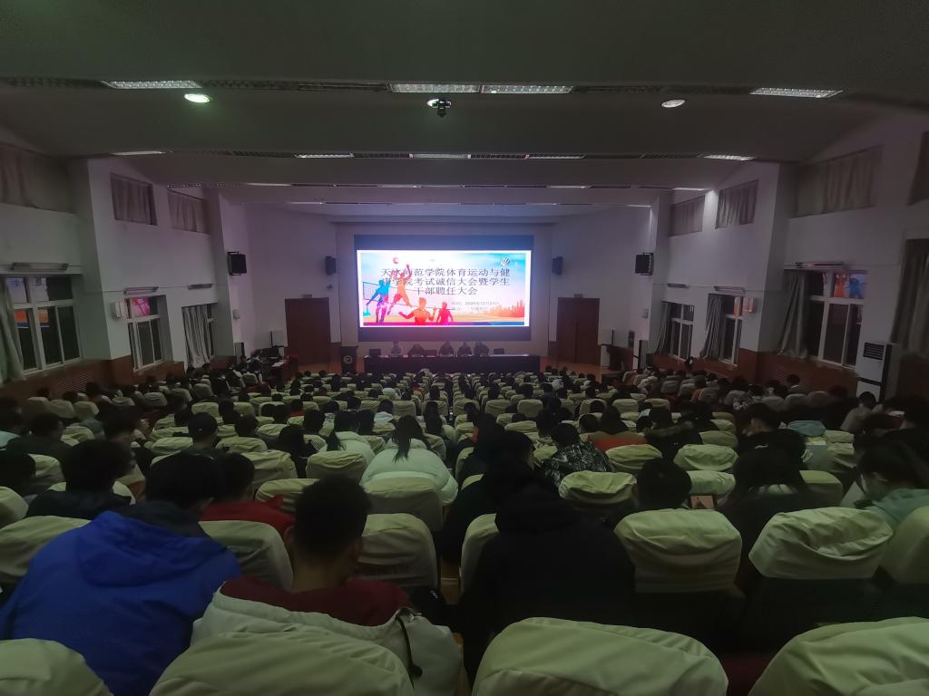 12月21日晚,体育学院在二号报告厅召开考试诚信教育大会暨学生干部聘任大会,学院党政领导班子,各教学系(部)主任,辅导员,19级、20级各班班主任,20级全体学生,以及19级、18级、17级各班学生代表共计370多人参加。大会由学院团委书记王昊支持。