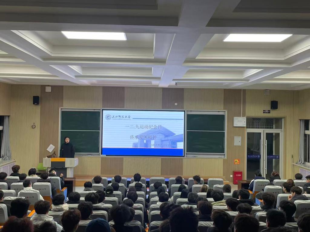 12月9日晚6:30,pp电子模拟器官网2025级全体学生在二教122阶梯教室齐聚一堂,召开以“一二·九运动纪念日:传承爱国精神”为主题的年级会议。会议由学院辅导员主持,210名学生全员参与,现场气氛庄重而热烈。