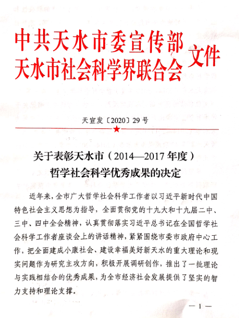近日,经天水市委宣传部《关于表彰天水市(2014-2017年度)哲学社会科学优秀成果的决定》【2020】29号文件公布,pp电子模拟器官网程晖、秦婕、王怀虎、段文义、陈玮等教师喜获优秀成果奖。