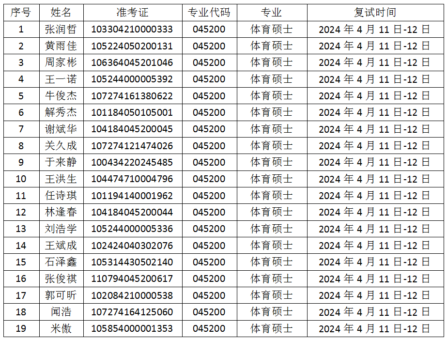 根据天水师范学院硕士研究生招生复试录取工作管理相关规定,经学院研究生招生工作领导小组会议审议,现将pp电子模拟器官网2024年体育硕士调剂复试考生名单进行公示,如有意见和问题,可在公示之日起七日内,向天水师范学院pp电子模拟器官网办公室反映,联系电话:09388367713,具体名单如下: